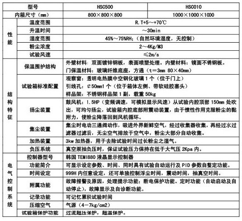 MC028系列沙塵試驗箱 一、產(chǎn)品簡介 本塵沙試驗箱主要滿足一下使用要求: 1. 防塵環(huán)境模擬試驗箱可以不受時間和季節(jié)的限制,隨時模擬自然界的典型環(huán)境條件,以模擬環(huán)境代替使用環(huán)境,可以節(jié)省大量的人力和物力,節(jié)約研制經(jīng)費。試驗具有“加速”性質(zhì),能夠縮短產(chǎn)品的試驗周期。 2. 依據(jù)用戶“防塵試驗技術(shù)要求”相關(guān)技術(shù)要求等資料編制。 3. 同時依據(jù)IEC60529-2001、GB/T4942.1-2006、GB/T4208-2008、GB 7001等相關(guān)標(biāo)準(zhǔn)。 二、技術(shù)參數(shù):